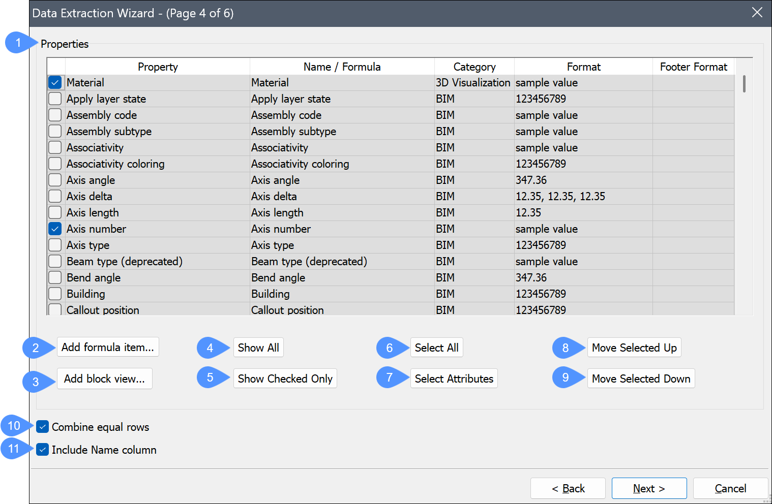 - Name/Formel: Listet den Namen der ausgewählten Objekte oder die Formel auf. Akzeptieren Sie die Standardnamen oder geben Sie einen benutzerdefinierten Namen ein. Die Eigenschaftsnamen werden in den Spaltenüberschriften im Datenextraktionsexport angezeigt.