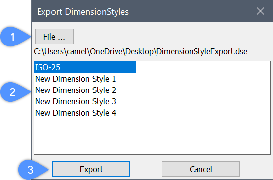 Exportiert die ausgewählten Bemaßungsstile in die angegebene DSE-Datei.