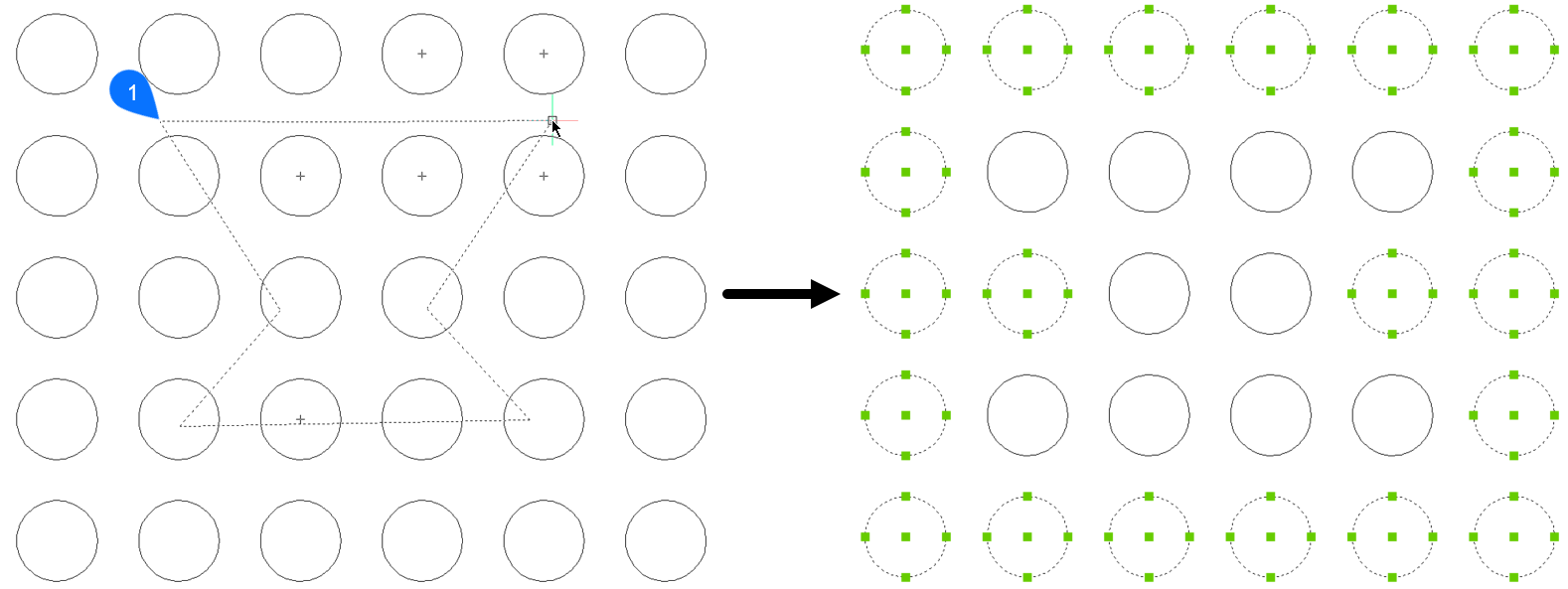 Zeichnen Sie ein temporäres Polygon (1), das durch eine gestrichelte Linie dargestellt wird. Alle Objekte in der Zeichnung werden ausgewählt, mit Ausnahme derer, die im Auswahlpolygon enthalten sind oder dieses schneiden.