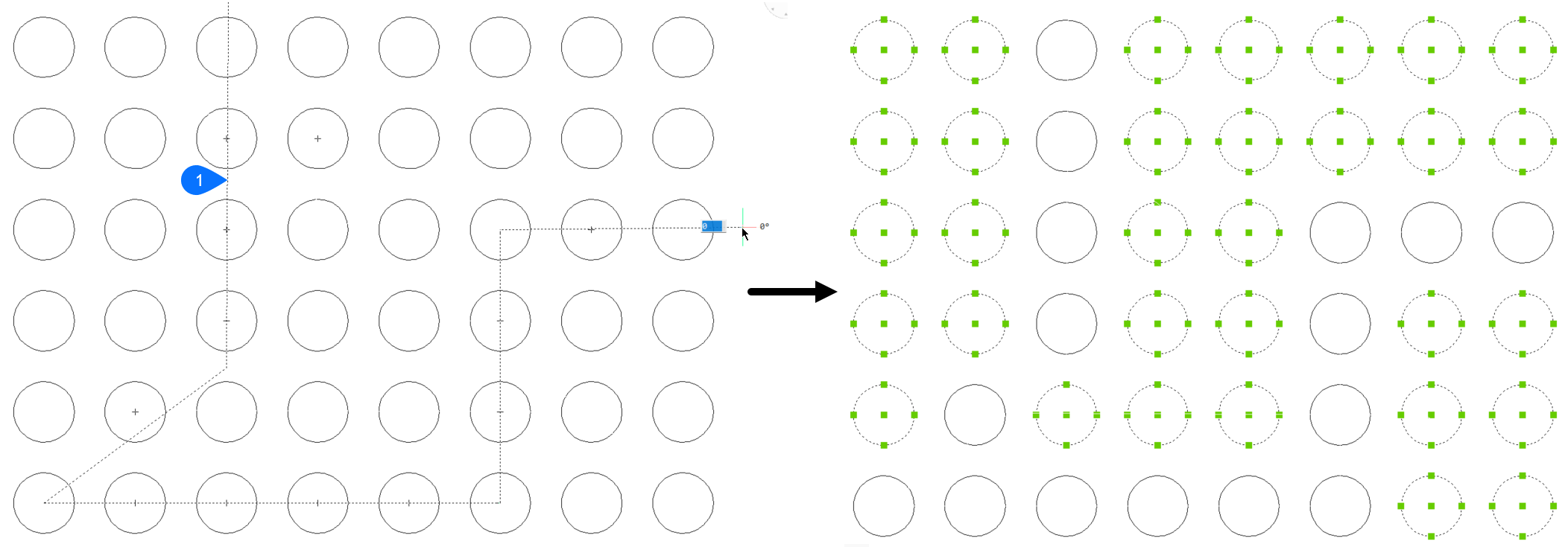Zeichnen Sie eine Polylinie (1), die durch eine gestrichelte Linie dargestellt wird. Alle Objekte in der Zeichnung werden ausgewählt, mit Ausnahme derjenigen, die die Zaunlinie schneiden.