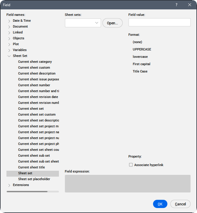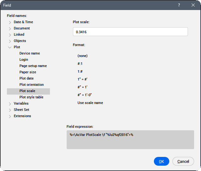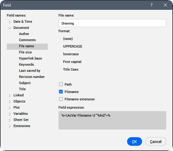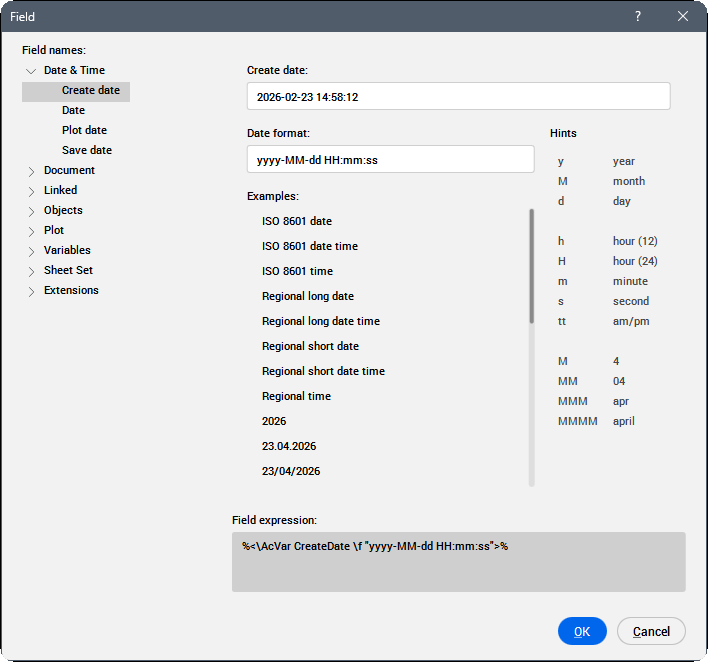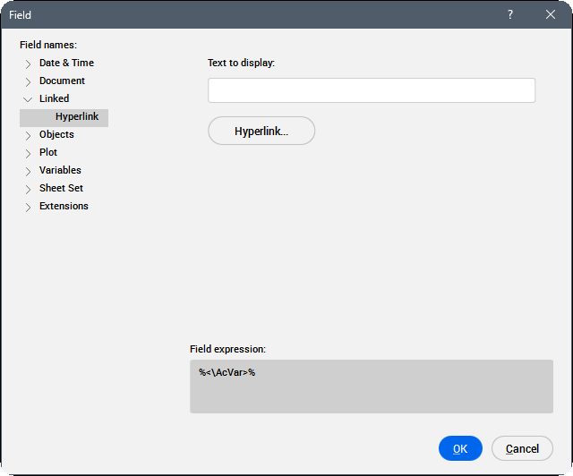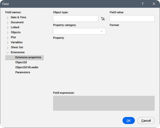 Anmerkung: Ein Feld ist ein variabler Text, der ein Codierungssystem verwendet, das das Programm automatisch aktualisiert und Daten als Zeichnungseigenschaften (z. B. einen Dateinamen oder das Speicherdatum), Objekteigenschaften (wie Länge, Fläche oder Layer), benutzerdefinierte Eigenschaften, Plot-Einstellungen, Variablen anzeigt. Wenn ein Feld keinen Wert hat, zeigt das Programm Bindestriche (----) an. Wenn die von der ausgewählten Eigenschaft referenzierten Informationen nicht gültig sind, wird der Wert für das Feld als #### angezeigt.