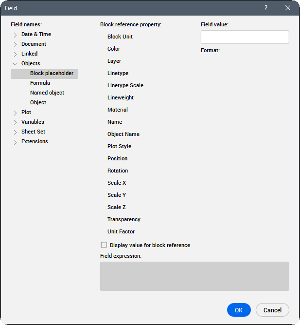 Informationen zum Erstellen von Blockeigenschaftsfeldern in einem Attribut finden Sie im Artikel zum Befehl ATTDEF. Wenn ein solches Attribut in einer Blockdefinition enthalten ist, zeigt das Feld den aktuellen Wert der Blockeigenschaft an.