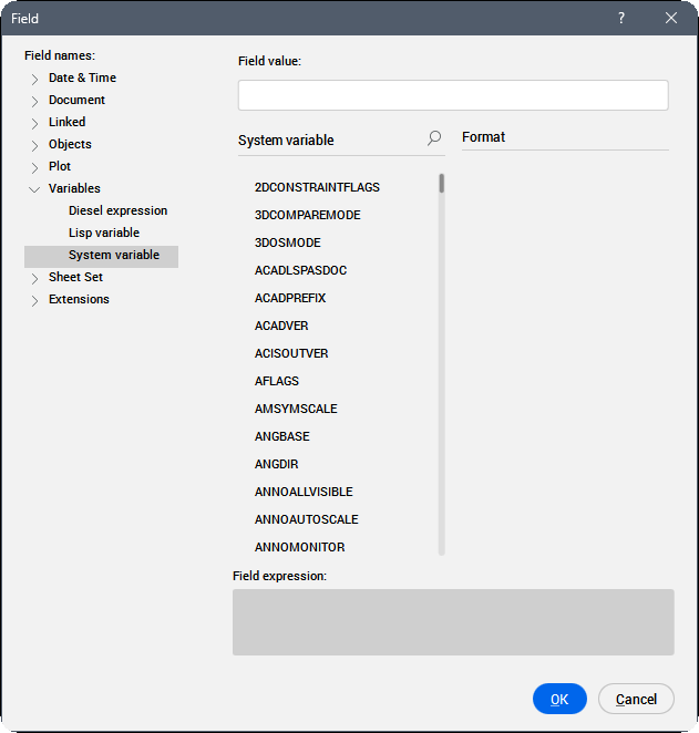Ermöglicht Ihnen, Felder zu erstellen, die den aktuellen Wert von Diesel-Ausdrücken, Lisp-Variablen und Systemvariablen anzeigen.