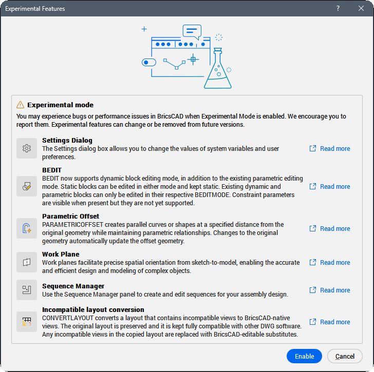 Wichtig: Es kann zu Fehlern oder Leistungseinschränkungen in BricsCAD® kommen, wenn der experimentelle Modus aktiviert ist. Wir möchten Sie bitten, dies zu melden. Experimentelle Features können sich in zukünftigen Versionen ändern oder entfernt werden.