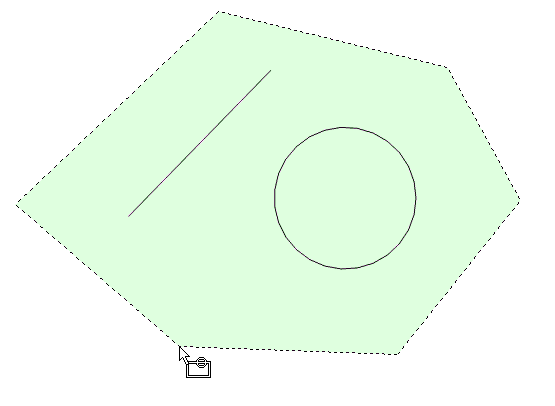 - Wählt alle Objekte, die sich innerhalb eines polygonalen Auswahl-Fensters befinden und dieses kreuzen. Der Umriss des Auswahl-Polygons wird mit einer gestrichelten Linie gezeichnet und ist mit transparentem Grün gefüllt.
