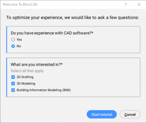 Öffnet den Dialog Willkommen bei BricsCAD, in dem Sie einige Fragen zu Ihren Erfahrung mit CAD-Software und Ihren Interessengebieten beantworten müssen.