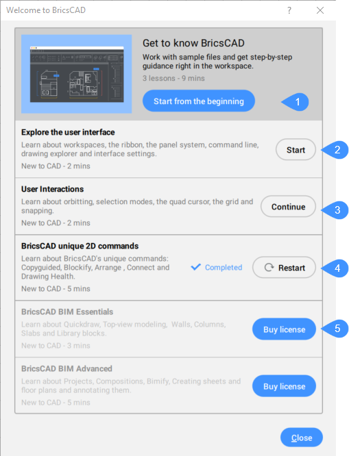 Öffnet die Bricsys-Shop-Seite, um eine höhere Lizenzstufe zu erwerben. Dadurch erhalten Sie Zugang zu Lektionen, für die eine höhere Lizenzstufe erforderlich ist.