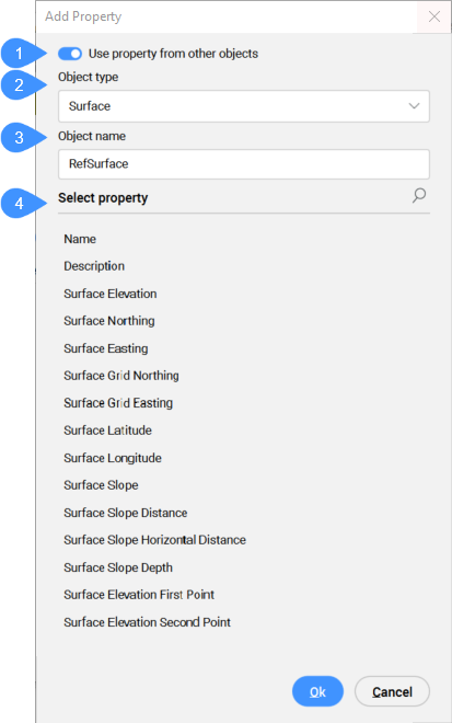 Wählen Sie den Objekttyp aus, aus dem Sie die Eigenschaft auswählen möchten. Eigenschaften können aus Oberflächen, horizontalen Achsen, vertikalen Achsen, Civil-Punkten, gemeinsamen Linien, gemeinsamen Kurven, Schnittansichten oder Schnittlinien hinzugefügt werden.