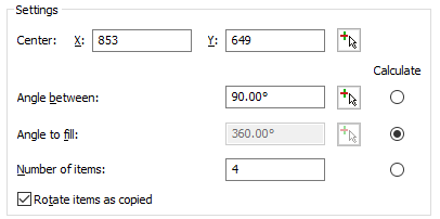 - Ermöglicht es Ihnen, den Füllwinkel basierend auf dem Winkel zwischen Elementen und der Anzahl der Elemente anzugeben. Durch Auswahl des Optionsfelds Berechnen werden die Optionen Winkel zum Füllen deaktiviert und die Optionen Winkel zwischen aktiviert.