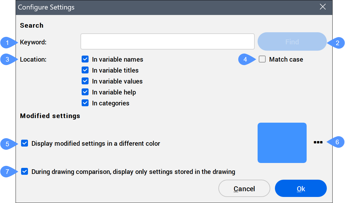 Im Dialog Einstellungen konfigurieren können Sie steuern, wie BricsCAD nach Variablen sucht und wie die Unterschiede verwaltet werden.