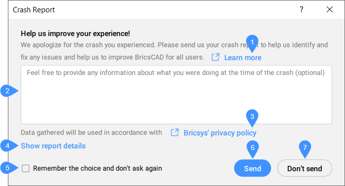 - Die über den Dialog Absturzbericht übermittelten Einstellungen werden in der Systemvariablen CRASHREPORTSENDING gespeichert. Der Standardwert ist 0, für den der Dialog immer angezeigt wird. Wenn Sie das Kontrollkästchen Speichern der Wahl und nicht wieder fragen aktivieren, wird der Wert der Systemvariablen CRASHREPORTSENDING auf 1 gesetzt, wenn die Option Senden verwendet wird, oder auf 2, wenn die Option Nicht senden verwendet wird. Weitere Informationen finden Sie im Artikel Senden von Absturzberichten über den Dialog Absturzbericht.