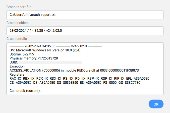 - Öffnet einen neuen Dialog mit Informationen über die automatisch generierte Datei crash_report.txt. Klicken Sie auf OK, um den Dialog zu schließen.