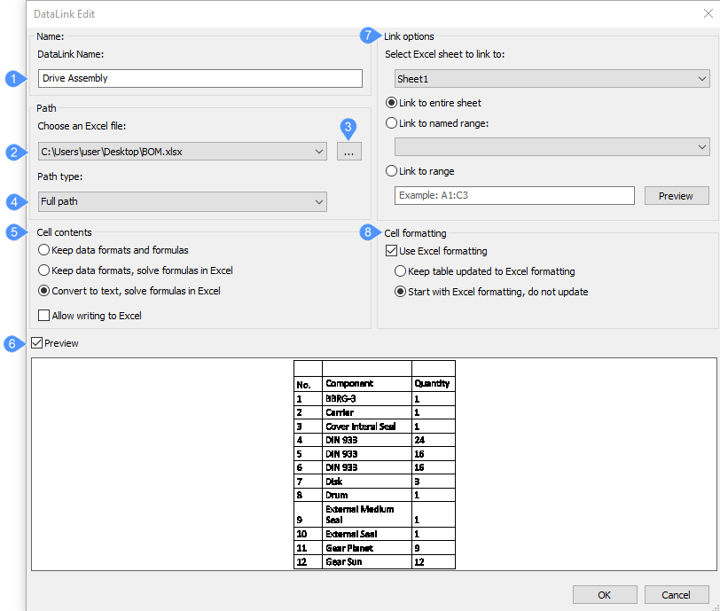 Mit dem Dialog Datenverknüpfung bearbeiten können Sie Daten aus einem Excel-Arbeitsblatt direkt mit Zeichnungstabellen verknüpfen, um sie bidirektional zu aktualisieren.