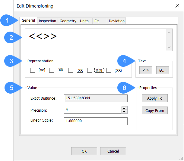 - Kopieren von: Ermöglicht es Ihnen, Eigenschaften von einem ausgewählten Objekt in den Dialog Bemaßung bearbeiten zu kopieren. Klicken Sie auf die Schaltfläche Kopieren von und wählen Sie ein Objekt aus, von dem Sie Eigenschaften kopieren möchten. Dadurch wird der Dialog Eigenschaften geöffnet, in dem Sie die Eigenschaften auswählen können, die Sie in den Dialog Bemaßung bearbeiten kopieren möchten.