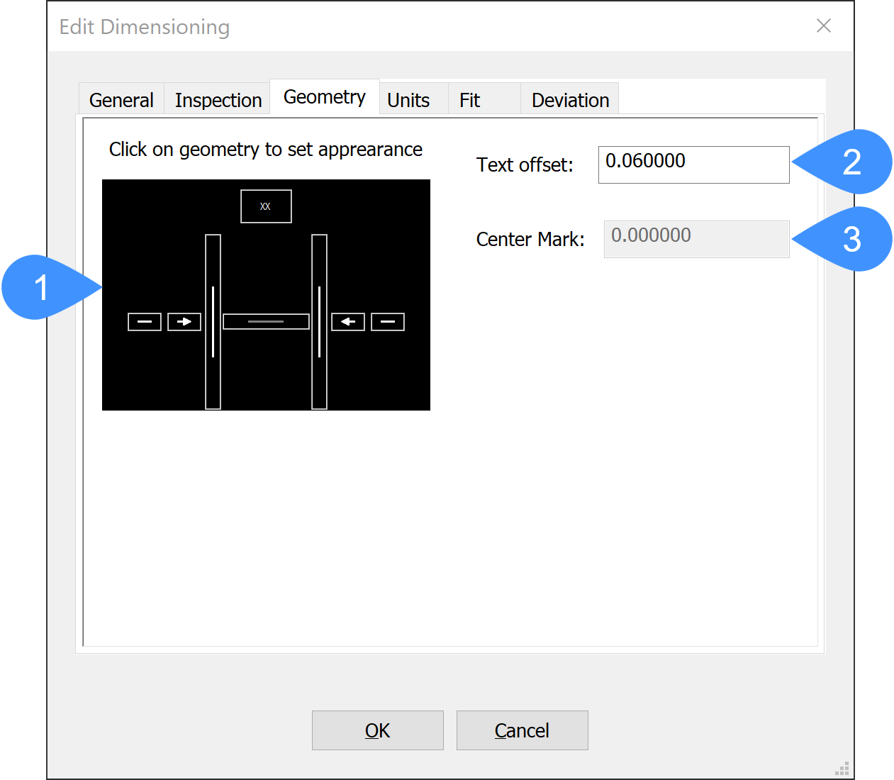 - Spezifiziert die Größe der Mittelpunktmarkierung. Diese Option ist nur mit einer Radius- oder Durchmesserbemaßung aktiviert, wenn die Option Mittelpunkt anzeigen im Feld Geometrie aktiviert ist.