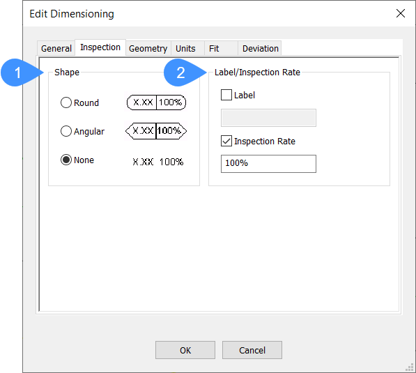 - Beschriftung: Schaltet die Beschriftung ein oder aus, die einzelne Inspektionsbemaßungen identifiziert. Sie können eine Beschriftung in das Feld Beschriftung eingeben, wenn Beschriftung aktiviert ist.