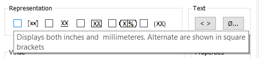 - Fügt dem angezeigten Bemaßungstexte Textelemente hinzu. Das linke Symbol schaltet ein und aus, ob der Bemaßungswert angezeigt wird, und Sie können spezielle Zeichen aus dem Dialog Spezielle Zeichen auswählen, wenn Sie auf das Zeichenfeld klicken.