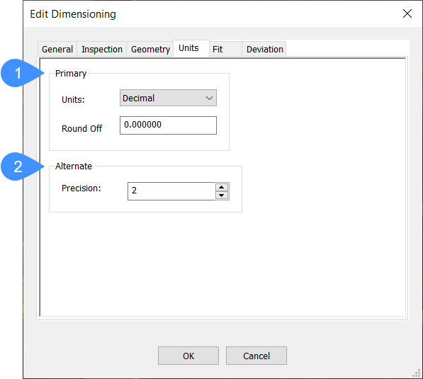 - Abrunden: Gibt die Anzahl der Dezimalstellen an, die zum Abunden der Bemaßungswerte verwendet werden.