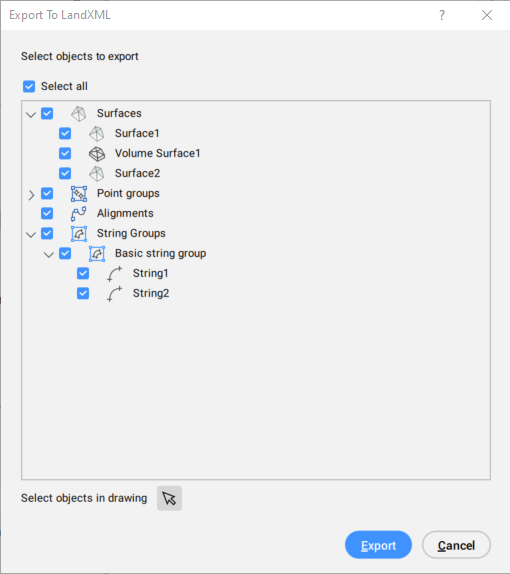 Klicken Sie auf das Auswahlsymbol (), um den Dialog Nach LandXML exportieren vorübergehend zu schließen und Objekte in der Zeichnung zum Exportieren auszuwählen.