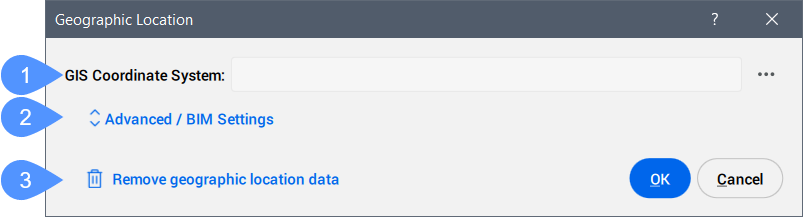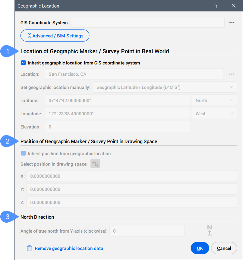 - Entfernt die geografischen Positionsdaten aus der Zeichnung.Anmerkung: Der geografische Standort wird automatisch in der Zeichnung gespeichert und kann mit dieser Option manuell entfernt werden.