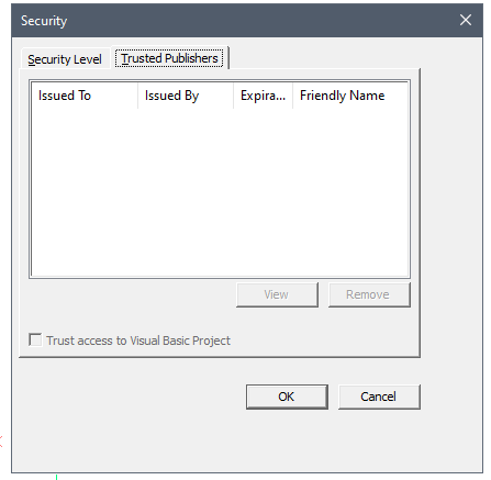Listet die Namen der VBA Makros auf, welchen vertraut werden kann. Dies sind die einzigen Makros, die ausgeführt werden können, wenn die Sicherheit auf "Hoch" eingestellt ist.