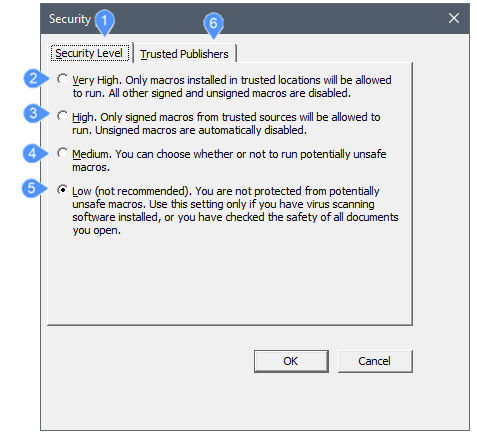 Im Dialog Sicherheit wird die Sicherheitsstufe auf Niedrig, Mittel, Hoch oder Sehr Hoch eingestellt, um festzulegen, ob VBA-Makros automatisch ausgeführt werden dürfen.
