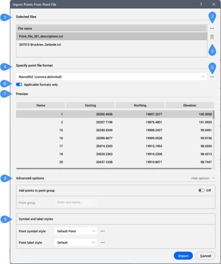 Im Dialog Punkte aus Punktdatei importieren können Sie eine oder mehrere Punktdateien auswählen, um Civil-Punkte zu erstellen.