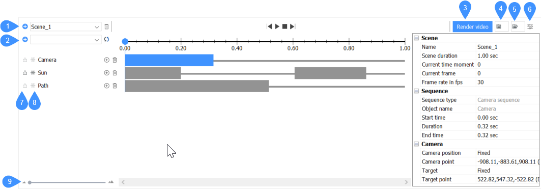 Mit dem Panel Animationseditor können Sie Zeitpläne für multiparametrische Animationen mit komplexen Kamerabewegungen erstellen und diese als 2D-Videos rendern.