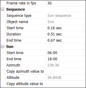 Einer der Parameter, die hinzugefügt werden können, ist der Sonneneffekt. Nachdem die Sonne-Animationssequenz zur Zeitachse hinzugefügt wurde, sind im Eigenschaftenkonfigurator des Panels Animationseditor mehrere Eigenschaften verfügbar.