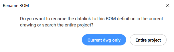 - Datei umbenennen: Öffnet den Dialog Stücklistendatei umbenennen, in dem Sie einen neuen Namen für die Datei eingeben können. Klicken Sie auf Umbenennen, um den Dialog Stückliste umbenennen zu öffnen. Hier können Sie wählen, ob Sie die Datei nur in der Aktuellen dwg oder in der Gesamtes Projekt umbenennen möchten.