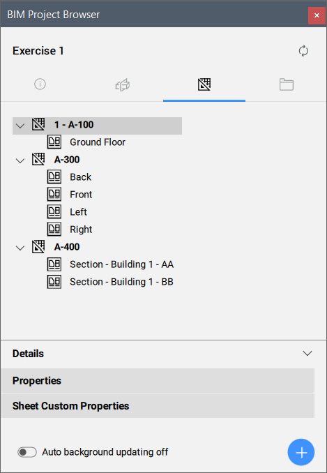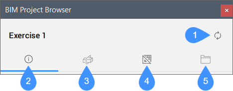 Das Panel BIM Projekt-Browser besteht aus vier Registerkarten und einer Aktualisierungsschaltfläche.