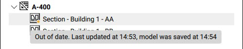 : Die Planansicht ist veraltet.Anmerkung: Bewegen Sie den Mauszeiger über die Planansicht, um einen Tooltip anzuzeigen, der den Status, den Zeitpunkt der letzten Aktualisierung des Abschnittsergebnisblocks und den Zeitpunkt der Speicherung des Modells erklärt. Auf diese Weise können Sie überprüfen, ob der Speicherzeitpunkt des Modells nach der Aktualisierungszeitpunkt der Planansicht liegt.