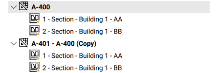- Plan kopieren: Erstellt eine Kopie der DWG-Datei des Plans und des Planeintrags im Plansatz (unter demselben Teilsatz). Alle Blöcke, Ansichtsfenster, benannten Ansichten und Planansichten werden ebenfalls kopiert. Der Name und die Nummerierung des kopierten Plans werden automatisch verarbeitet.
