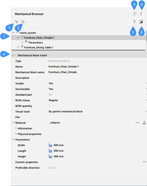 ), um den Dialog Mechanical Eigenschaften zu öffnen. - Bevorzugte Richtung: Gibt die Richtung für Explosionsansichten an, die mit dem Befehl BMEXPLOSIONKONFIG festgelegt wird.