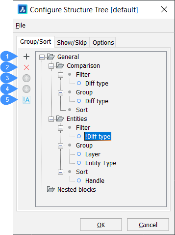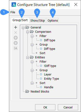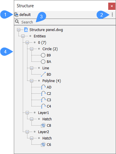 Zeigt eine strukturierte Baumansicht des Zeichnungsinhalts an. Die Konfiguration des Strukturbaums wird in einer CST-Datei definiert und durch die Systemvariable STRUCTURETREECONFIG festgelegt. Der Speicherort der CST-Dateien wird durch die Systemvariable SRCHPATH festgelegt. Sie können benutzerdefinierte CST-Dateien erstellen, die Ihren Anforderungen entsprechen.