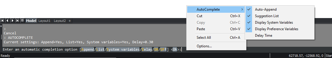 Questo comando imposta il comportamento della funzione di completamento automatico nella riga di comando di BricsCAD®. A tale scopo, è necessario definire come aggiungere ed elencare i comandi e le variabili di sistema visualizzati.