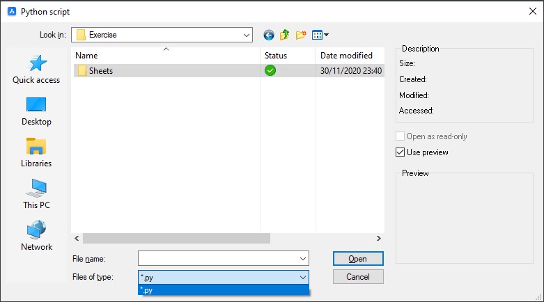- A dialog box is displayed where you can only select a Python script file (*.py). Select it and click Open to execute the file.