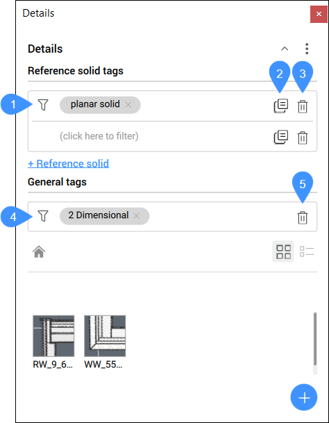 - Deletes the selected reference solid.Note: you can click the cross next to the tag name to delete only one tag from a Reference solid