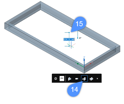- When the extrude mode is on the Subtract option (14), move your cursor downward (15) to create an opening in the fixed frame.