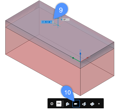 - Next, extrude the top face of the subtractor solid in the negative Z direction (9) using the Extrude tool ‘Create’ (10) option by pressing the Ctrl key once.