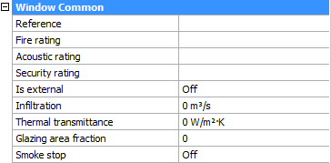 - Optionally, you can assign more information to the window after inserting it into a new drawing. The following illustration shows the Window Common category of BIM properties from the Properties panel that becomes available after selecting the element. Information can be assigned about the thermal transmittance coefficient of the window materials, fire rating according to the national fire safety classification, and so on.