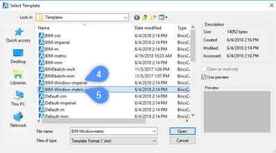 - Select one of the pre-defined templates to create a simple window specifying the unit system of your drawing.Note: The pre-defined templates contain the layers needed to create the geometry of the window or door. These DWT file format templates are BIM-Window-imperial (4) and BIM-Window-metric (5) which assure the required layers and properties are displayed in your drawing.