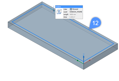 - Use the DMEXTRUDE command to extrude the inside boundary of the window frame.Note: The height of the extrusion equals the thickness of the glass pane. The following illustration shows the inside boundary of the window frame after using DMEXTRUDE command to create a window glass pane.