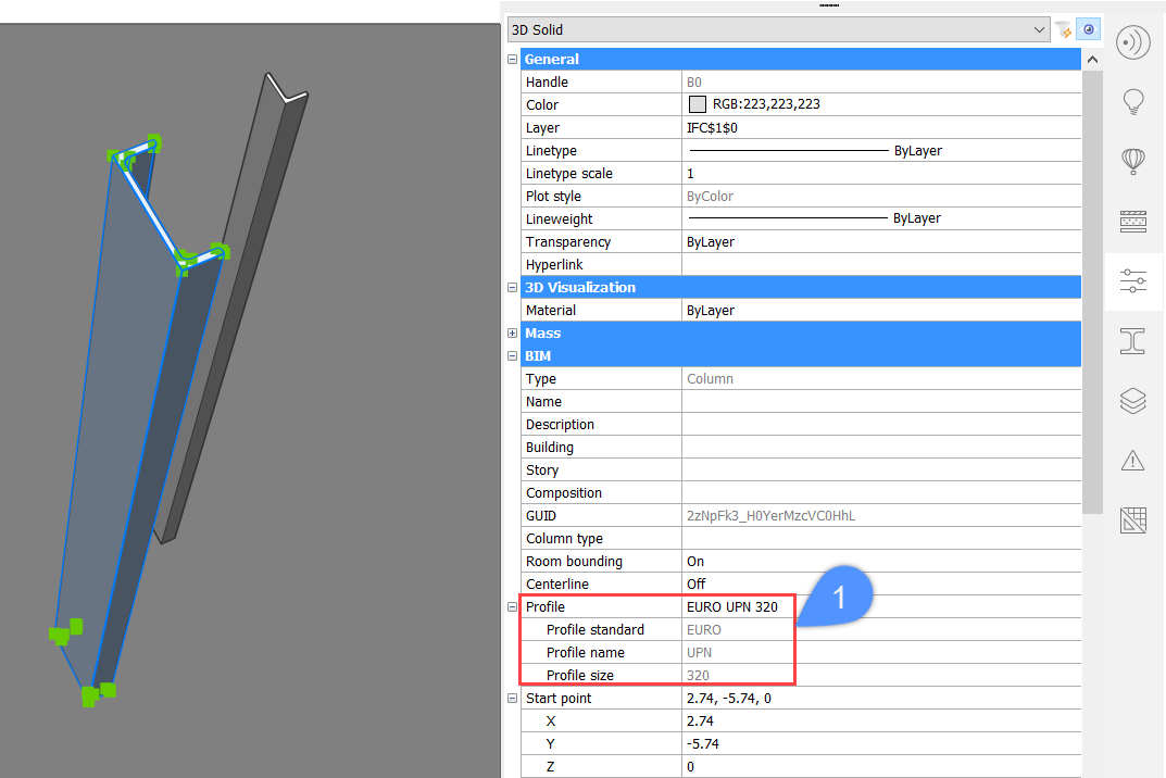 When importing profiles from an IFC file to BricsCAD®, you can either import the profile properties in the IFC file, or let BricsCAD® look for corresponding profiles in the Project and Central Database, based on the geometry. The profiles are then assigned with proper Profile Standard, Profile Name and Profile Size in the Properties panel (1).
