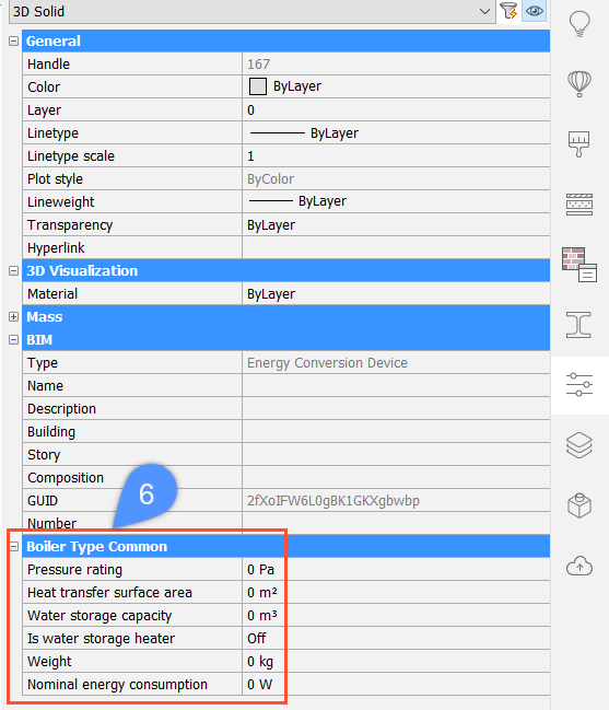 - Select an object of the type or category that you just enabled the Property Set for (in this example an Energy Conversion Device). Go to the Properties panel. Scroll down to the section of properties you just enabled.