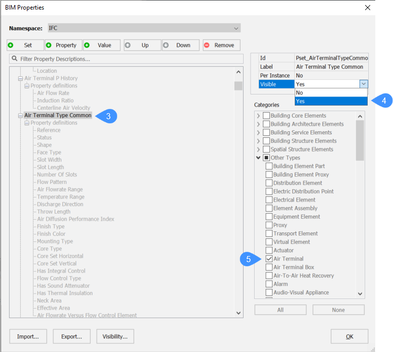 BricsCAD® BIM supports IFC2x3 and IFC4 for Import and Export. The IFC2x3 and IFC4 property namespaces are merged into IFC namespace. Differences between the IFC schemas is dealt with in the background during IFC Import or Export. The IFC standard includes both parametric and non-parametric shapes, material definitions, metadata in the BIM file, and property sets (PSets).