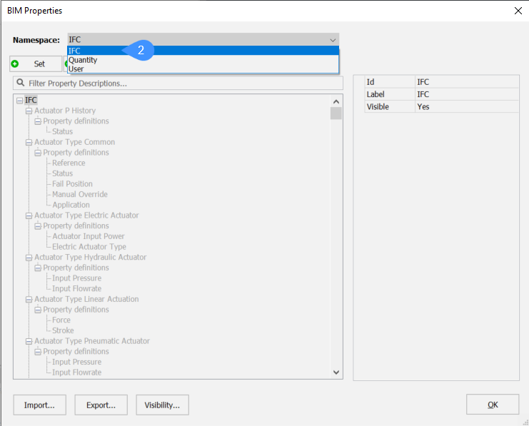 Note: All IFC2x3, IFC4, IFC4x1 and, IFC4x3 (IFC 4.3.2.0) files can be imported, but all are merged into a single IFC namespace. Differences between these schemas are dealt with in the background during IFC Import. When the IFC file is imported the data from the imported file integrates with the BricsCAD® data structure which means you can work with them right away. If the imported data contains custom properties, these property sets are made available.Important: IFC4x1 is not an official version. While we support importing IFC4x1 files, the code is not actively maintained, and we advise using other IFC versions.You can create custom property sets and properties directly in BricsCAD® BIM and associate them with imported entities.