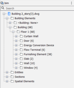 Note: If the elements are not classified, run the BIMIFY command to classify the model. - The building consists of several building elements: walls, slabs, doors, windows etc.