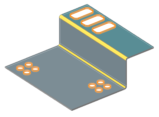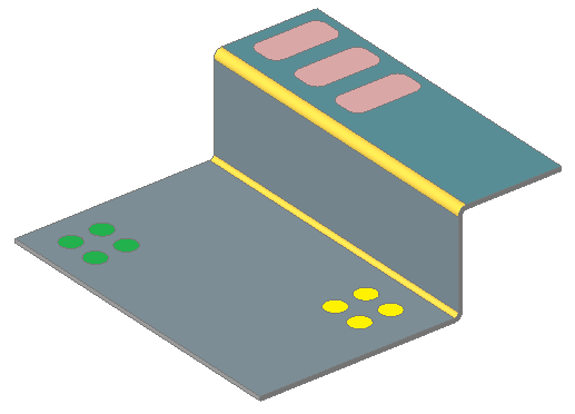 - Press Enter to process the sheet metal part.The command reports must look like the one below:Created 4 distance constraintsCreated 3 fix constraintsCreated 0 coincident constraintsCreated 0 tangent constraintsCreated 0 rigid set constraintsCreated rectangular array 2x2 basing on Hole_3 featureCreated rectangular array 2x2 basing on Hole_7 featureCreated rectangular array 3x1 basing on Hole_9 featureTotal: 7 constraints and 3 array(s) createdNote: Feature names and constraint distribution may differ depending on the BricsCAD version.To examine the arrays, you can temporarily unfreeze the BC_SUBTRACT layer.In the image below the arrays are colored manually.