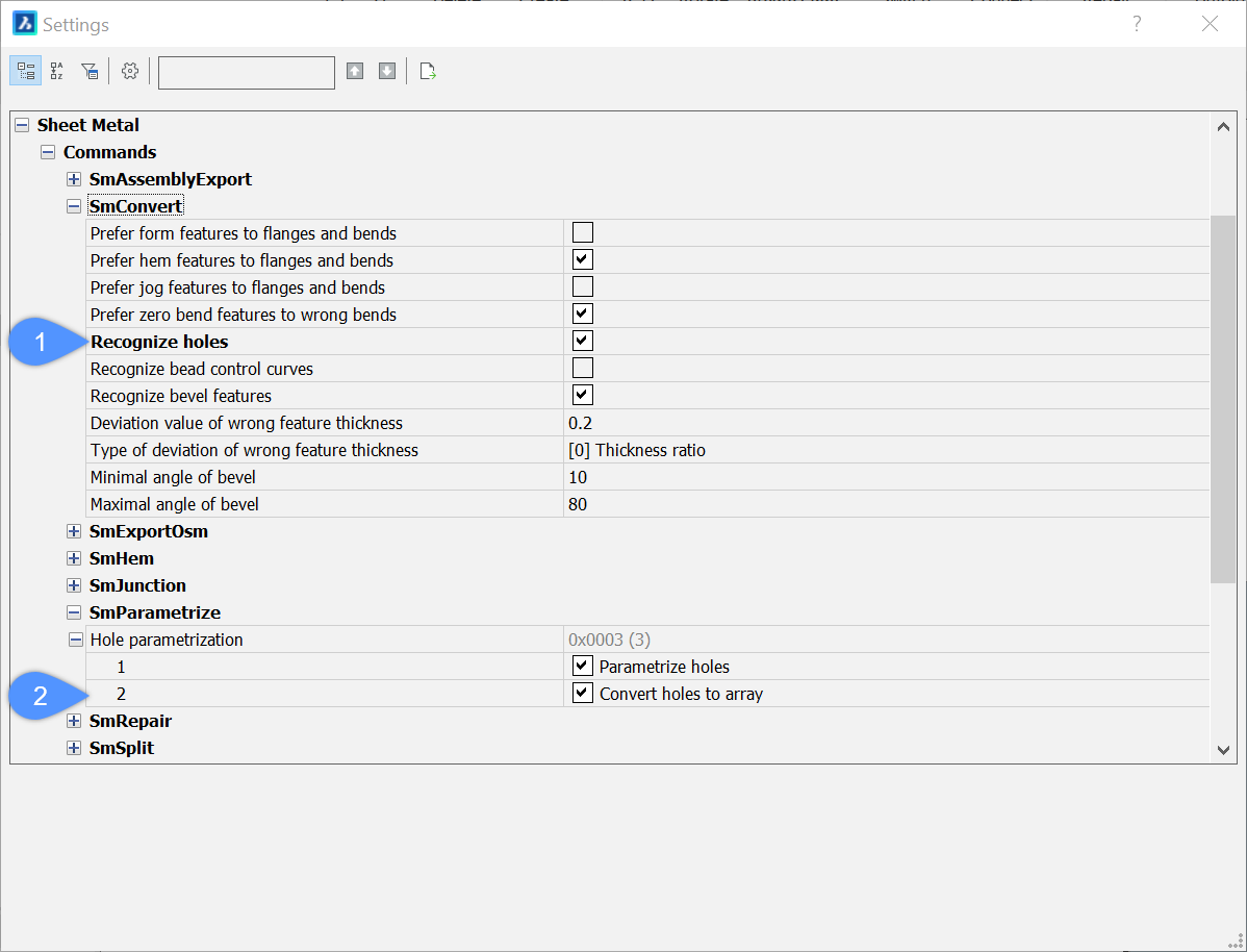 - Enable the Convert holes to array (2) and Parametrize holes options for the SMPARAMETRIZE command.